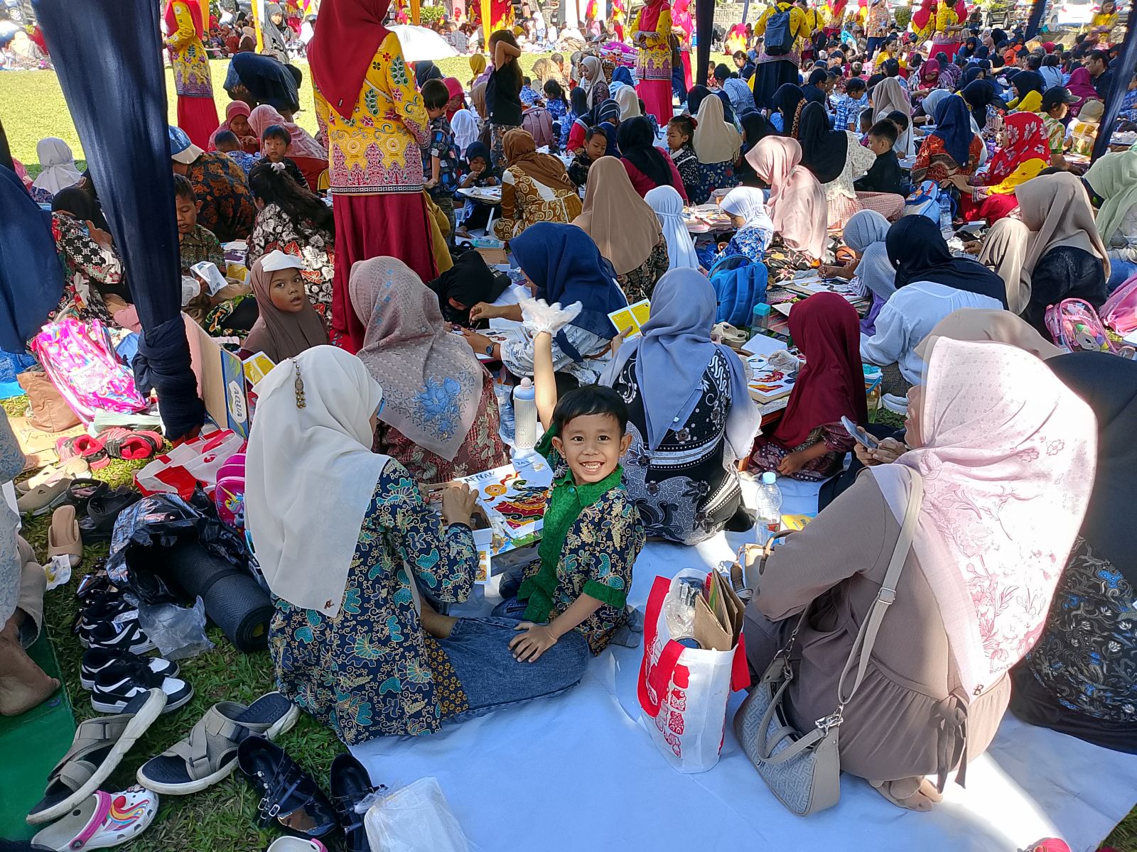 Murid TK Hasanah, Afnan Rafidan, terlihat antusias mengikuti lomba membatik di lapangan MPP Pekanbaru.