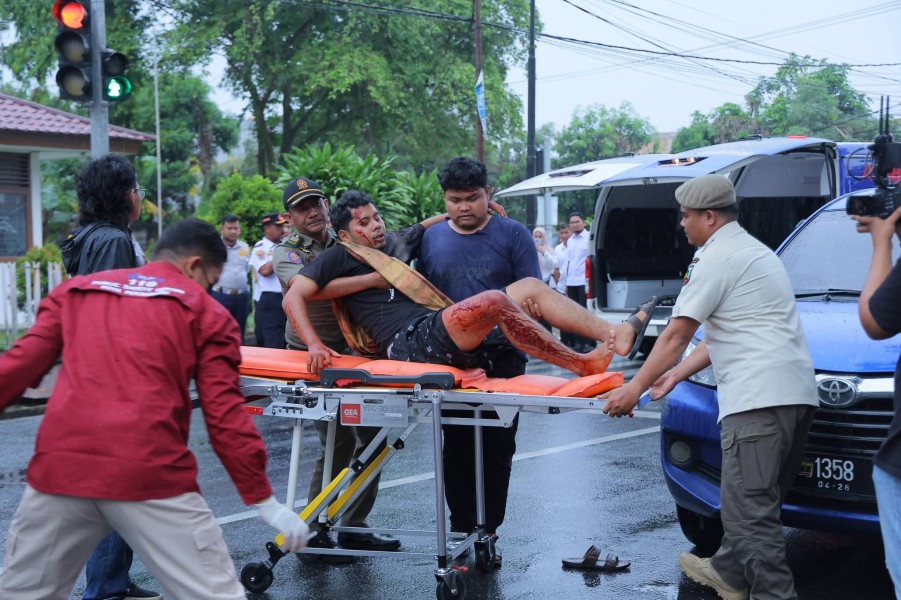 Personel TRC Pekanbaru melakukan simulasi penanganan kecelakaan lalu lintas pada peluncuran nomor pengaduan 112, pada 1 April 2026.