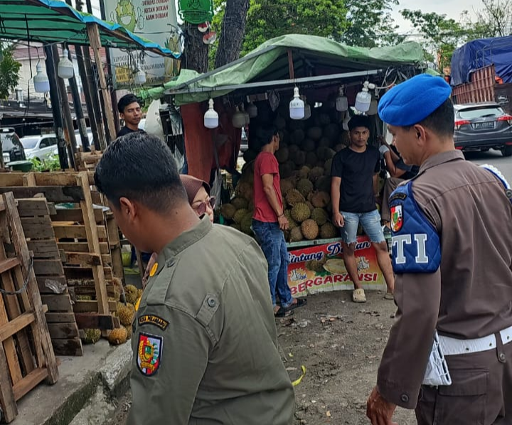 Betuah Pekanbaru - Satuan Polisi Pamong Praja (Satpol PP) Kota Pekanbaru, menertibkan pedagang durian yang berjualan di pinggiran .